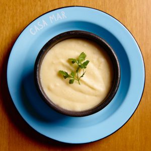 Mandioca cremosa com manteiga de garrafa, serve duas pessoas. Porção individual R$ 9,00.