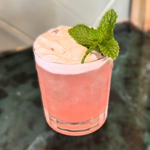 Gin Tanqueray, Morango com Elderflower, Limão, Pink Lemonade e Espuma de Gengibre.