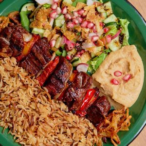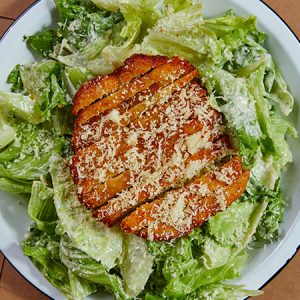 Alface americana, faláfel, maionese de alho, picles de cebola roxa, picles de maxixe e mini rúculetas.