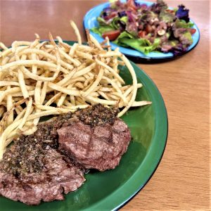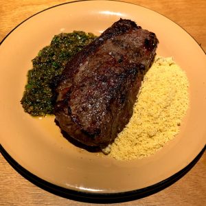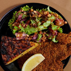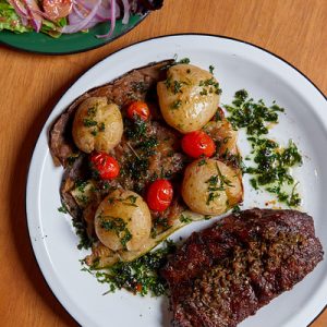 Trilogia de cogumelos (shitake, shimeji e paris), grelhados na brasa e salteados com sakê e azeite, servido com batatas assadas e salsa fresca.