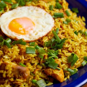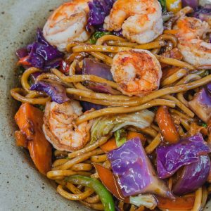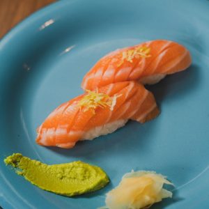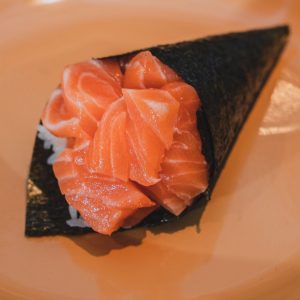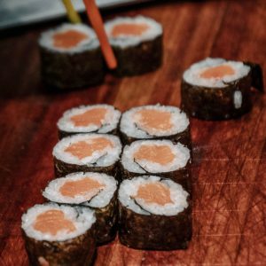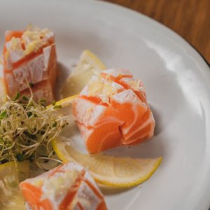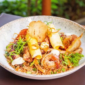 Gohan tradicional, 2x Salmão, 2x Camarão, Molho Tradicional, geleia de pimenta, couve crispy, sunomono, farofinha mahalo e cebola crispy.