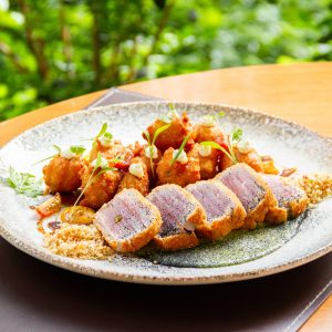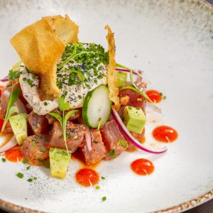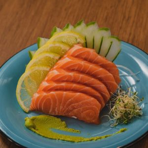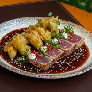 Atum selado na crosta de gergelim com acompanhamento de sunomono e finalizado com um fio de tarê (aprox. 280g)