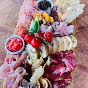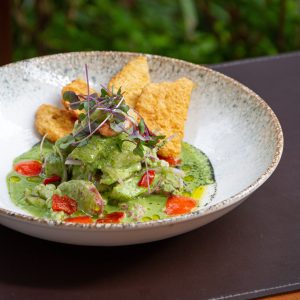 Brócolis levemente cozido, cenoura cortada em pequenas tiras, palmito picado, alho-poró e azeitonas, todos salteados no azeite. Acompanha geléia de pimenta.