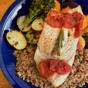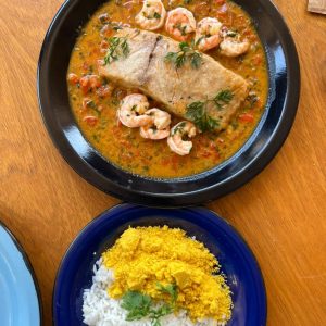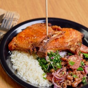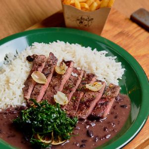 Versão vegetariana do nosso arrumadinho! Banana da terra grelhada, farofa de cuscuz, vinagrete e feijão fradinho
