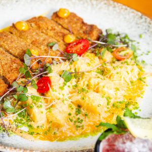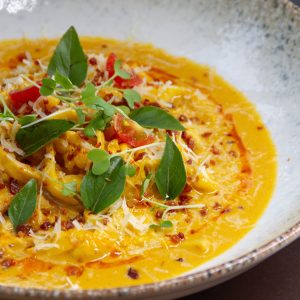 Gnocchi de batata baroa frito ao molho duo, com folhas de manjericão e parmesão ralado.