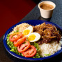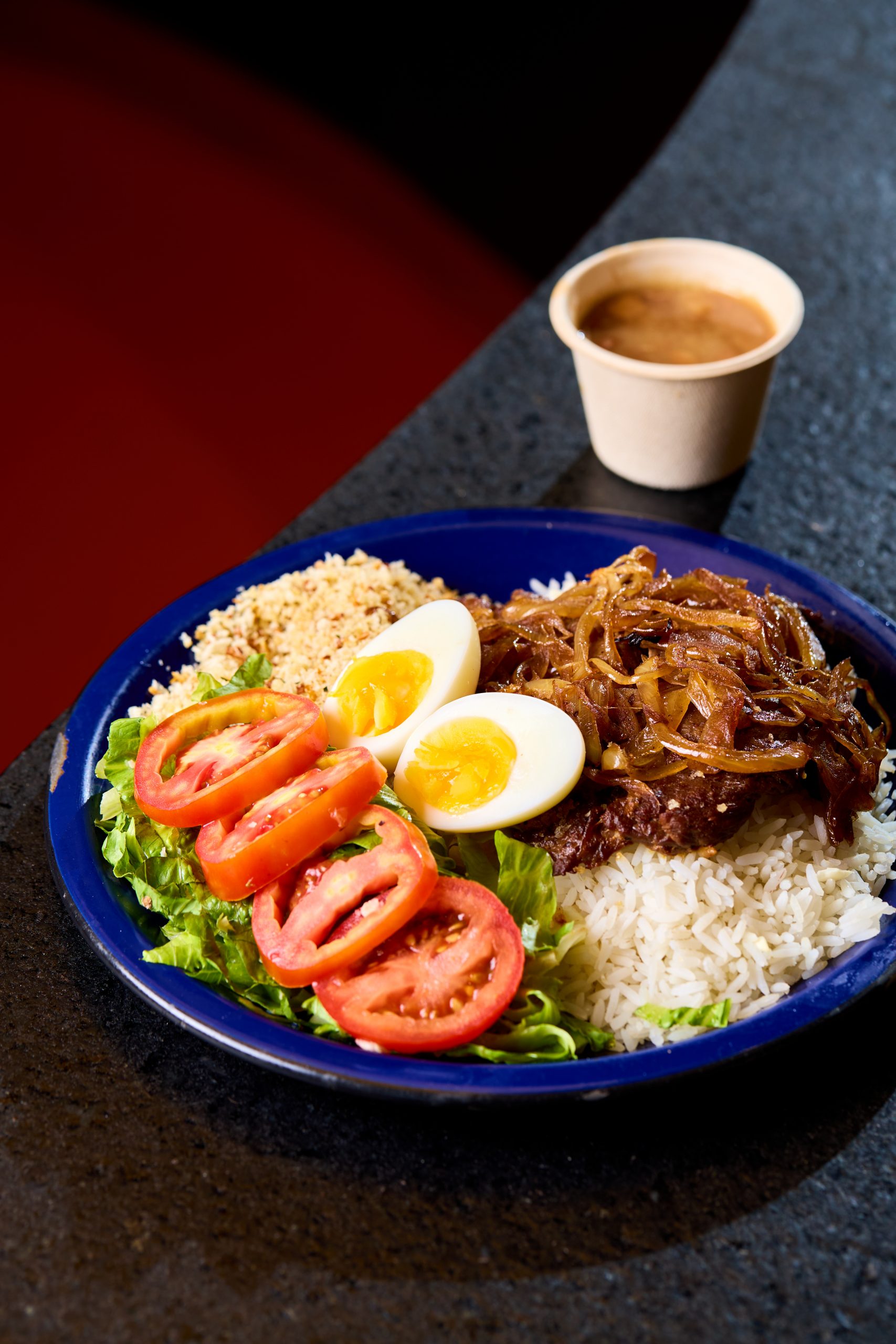 Bife acebolado com ovo cozido, arroz, feijão da mãe do Igor, farofa e salada.