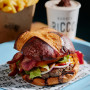 Pão pretzel da Casa do Padeiro, blend Ricco 160g, queijo do reino, boicon beef passion (feito na costela do boi), maionese de mostarda, tomate, alface snack e cebola roxa.