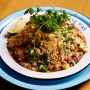 Arroz e feijão verde juntos, com carne de sol desfiada, queijo coalho e manteiga de garrafa. Acompanha farofa da casa.