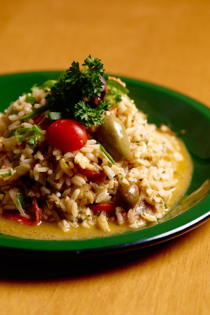 Arroz molhadinho com bacalhau, tomate assado e pimentão. Receita meio portuguesa, meio brasileira, um pé em Lisboa e outro no boteco.