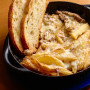 Baby beef em tiras ao molho 4 queijos acompanhado de batata Crispers, gratinado com mussarela e servido com pão da casa.