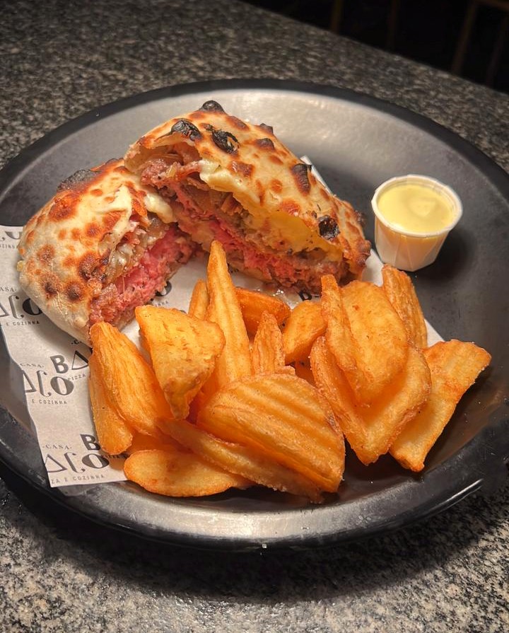 Hambúrguer de 180g grelhado, assado no forno a lenha na massa napoletana com queijo da canastra, cebola caramelizada e bacon, Acompanhado de batata frita.