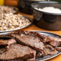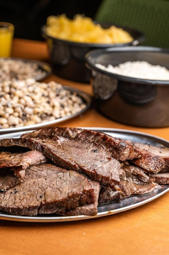 Já conhecida dos brasilienses: Carne de sol feita na churrasqueira, arroz branco, feijão fradinho, mandioca cozida e paçoca de carne.