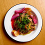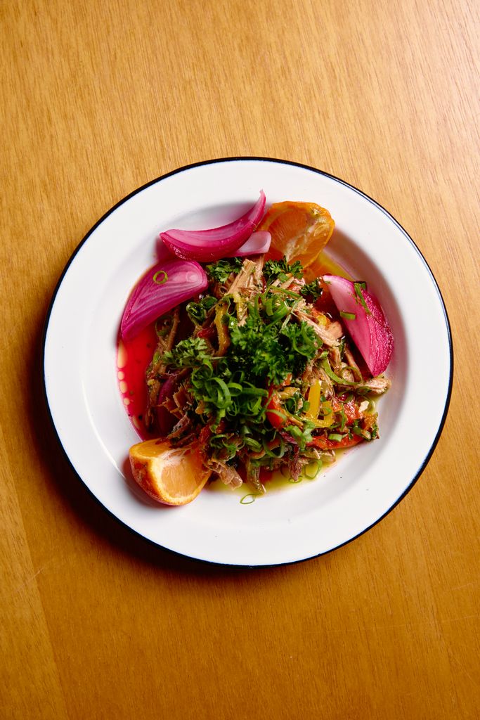 Lagarto cozido e fatiado no molho da saudade. Cebola, tomate, pimenta do reino, pimentões tostados, vinagre de maçã e bastante azeite . (200g)