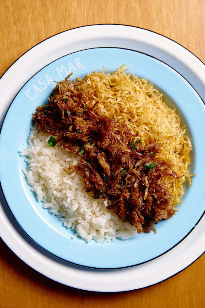 Carne serenada desfiada com arroz branco e batata palha da casa.