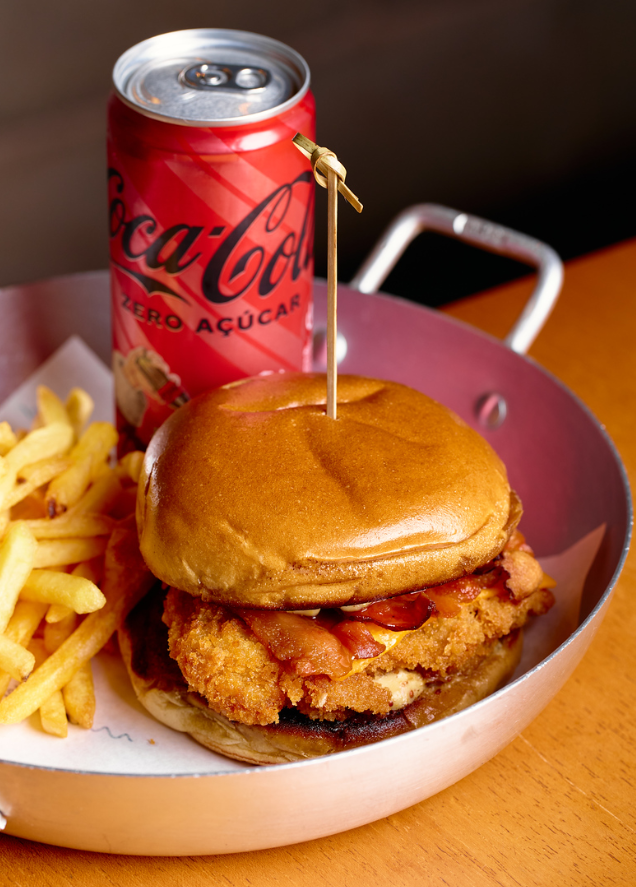 Essa é a combinação que deu certo. Frango crocante, cheddar derretido, bacon gourmetizado no mel e nosso molho Dijon Trufado. Um clássico instantâneo num pão brioche .tostadinho. Acompanha Fritas e Refrigerante Coca Coca/Coca Zero (Lata 310ml).