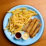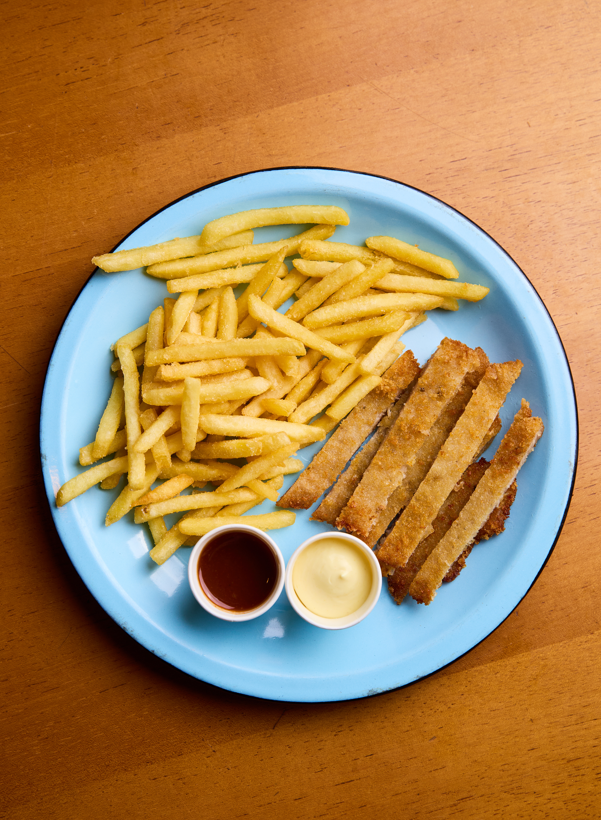 Nosso clássico preparado para o seu filho: Tirinhas de lombo empanadas e crocantes, acompanhadas de batatas fritas, maionese da casa e ketchup.