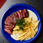 Denver na brasa filetado, batata palito e molho gorgonzola para chuchar.