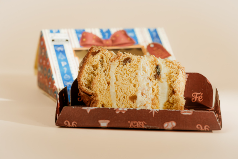 "Fatia do nosso Panettone com frutas cristalizadas, recheada com camadas de Brigadeiro Branco com Lascas de Chocolate Branco com um Mix Crocante. O sabor favorito dos natais da Perdomo, agora em uma nova experiência! 125g