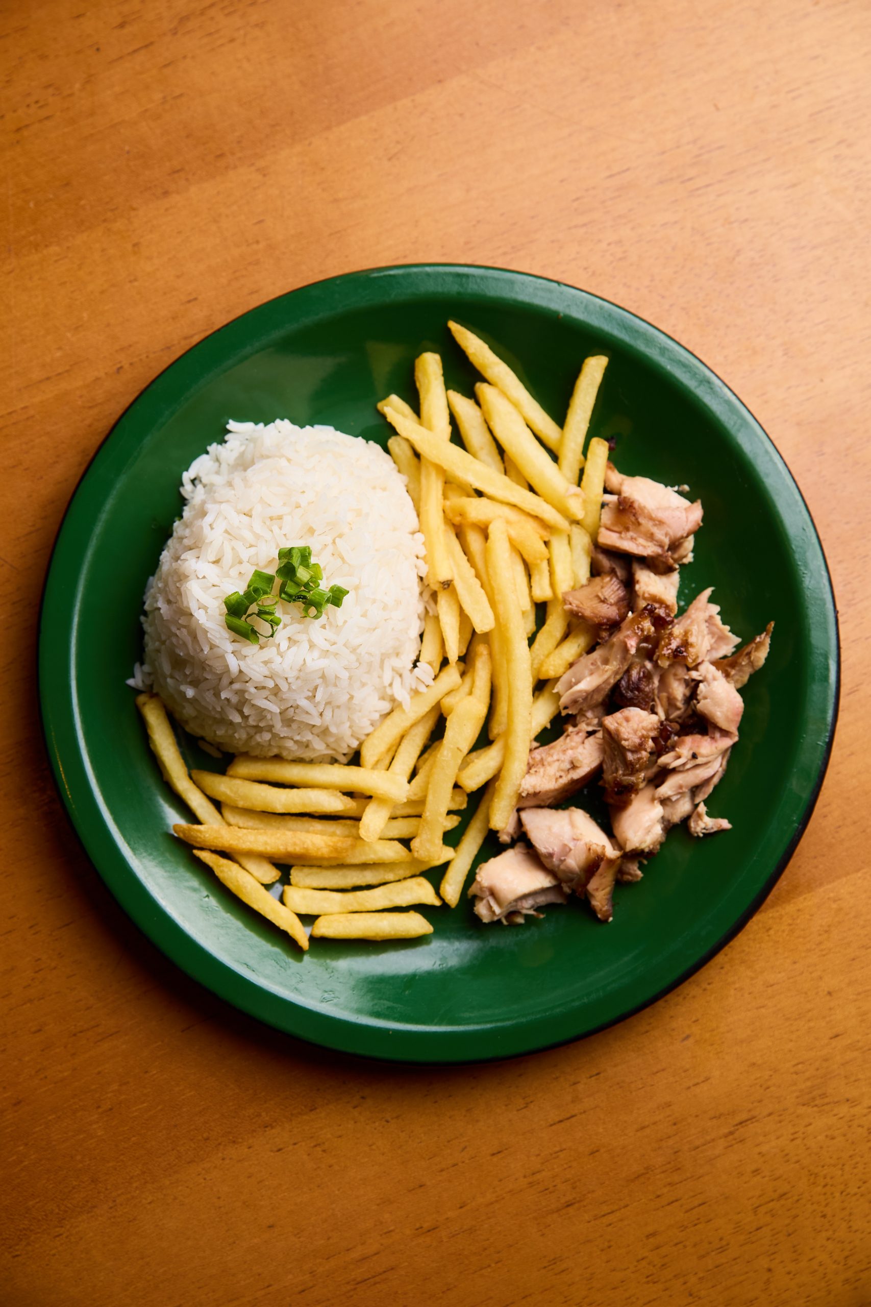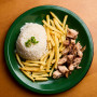 Sobrecoxa assada na brasa e picadinha, arroz branco e mais um acompanhamento à sua escolha. Escolha entre: batata frita, salada ou feijão.