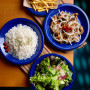 Iscas de carne de porco flambada acebolada (400g) com batata frita, + arroz e salada de folhas verdes. *Opção para compartilhar serve até três pessoas (400g).