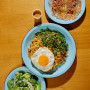 Salada fresca com folhas variadas, servida com um molho agridoce leve e refrescante, que desperta o paladar para a refeição.