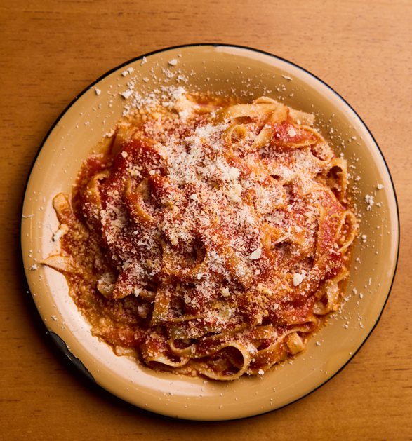 Fettuccine ao molho All 22, finalizado com parmesão.