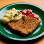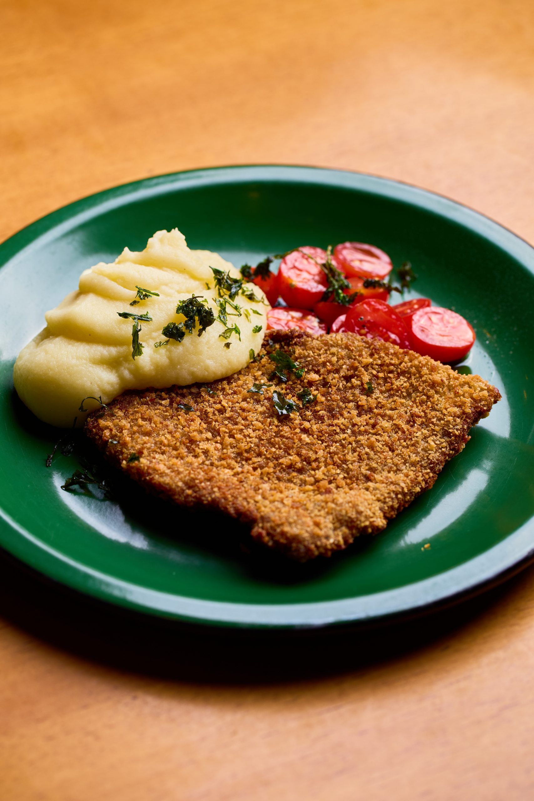Milanesa bovina (80g) acompanhada de purê de batatas ou batata palito e salada de tomate-cereja.