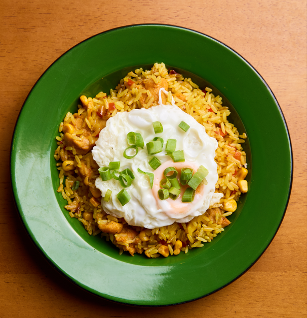 Arroz amarelo, galinha, pimentões coloridos e milho. Você ainda pode escolher com ou sem ovo estalado!