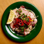 Fatiado com bastante cebola, alho e limão. Acompanha pão.