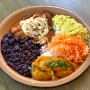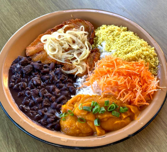 O verdadeiro PF brasileiro: Arroz soltinho, feijão preto temperado com dedicação, purê de abóbora, farofinha, salada fresca e frango acebolado.