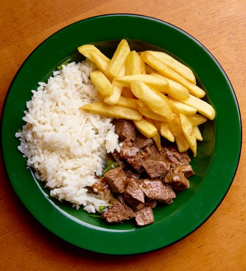 Picadinho de filé mignon com caldo de carnes, arroz branco e fritas.