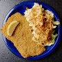 Milanesa de bife de Chorizo Angus. Acompanha salada morna de batata assada, alface americana com molho cesar e cebola crispy.