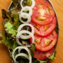 Mix de Folhas, tomate, cebola em rodelas e radicchio.