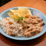 Strogonoff com filé mignon. O bonzão dos cremes. Vem com aquele arrozinho de alho laminado, salsa e os chips de batata que amamos.