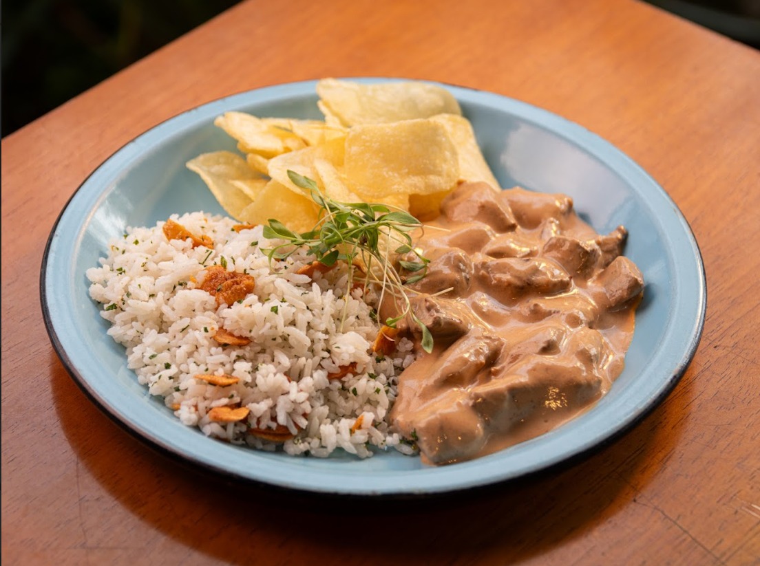 Estrogonofe com filé mignon. O bonzão dos cremes. Vem com aquele arrozinho de alho laminado, salsa e chips de batata ou batata palha, você escolhe.