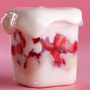 Gelato bem cremoso feito com morangos frescos, servido em uma casquinha feita por nós com borda de Crema e leite em pó, acompanha Brigadeiro ao Leite e Brigadeiro de Crema, finalizado com leite em ...