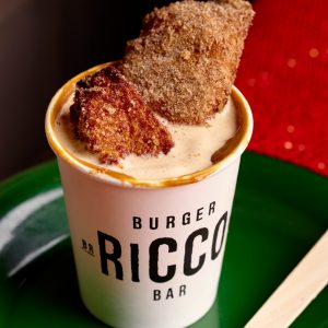 Casquinha de sorvete banhada no chocolate ao leite, recheada com brigadeiro de crema, creme de Nutella e pedaços de Kinder Bueno.