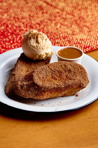 2 fatias de pão imersas em uma mistura cremosa de leite condensado, ovos, baunilha e leite. Fritas até dourarem e polvilhadas com canela em pó. Servidas com uma bola de sorvete de creme e acompanha...
