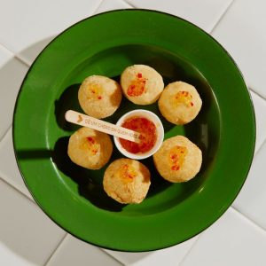 Bolinhas recheadas com bastante queijo e acompanhadas de geleia de pimenta. 6 unidades.
