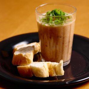 6 fatias de baguete da casa feita com levain, jamón Espanhol, azeite e pimenta do reino moída na hora e tumaca.