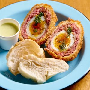O rei da estufa! Ovo com gema mole, abraçado por Blend de carne moída temperada e linguiça artesanal, frito até dourar. É o casamento perfeito entre ovo e boteco.