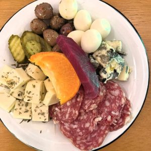 Nossos frios em um prato só. Punheta de bacalhau, carne louca, azeitona, gorgonzola, ovinho de codorna e língua ao vinagrete.