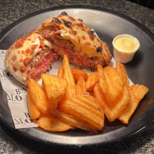 Hambúrguer de 180g grelhado, assado no forno a lenha na massa napoletana com queijo da canastra, cebola caramelizada e bacon, Acompanhado de batata frita.