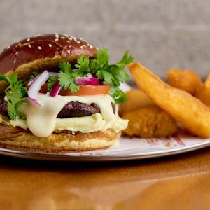 Saboroso Blend de Carnes com queijo tipo cheddar, cebola caramelizada no caldo de cana, finalizado no crispy de bacon.