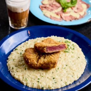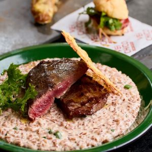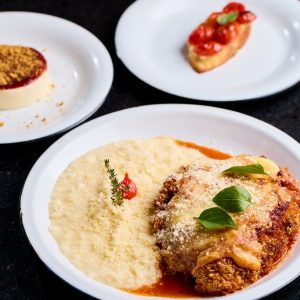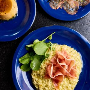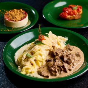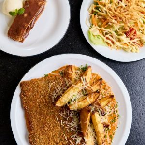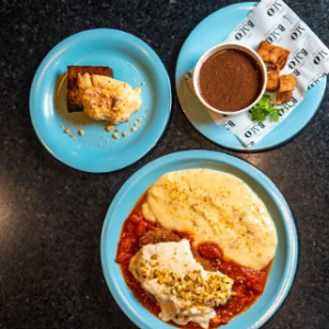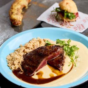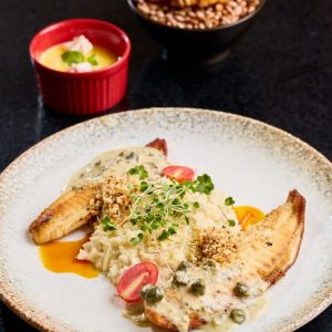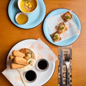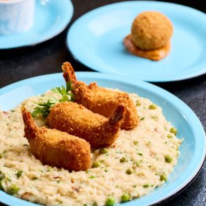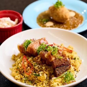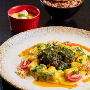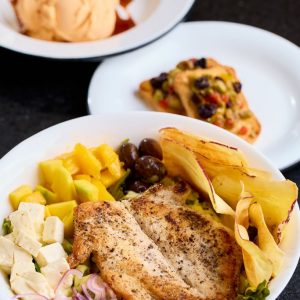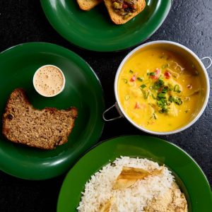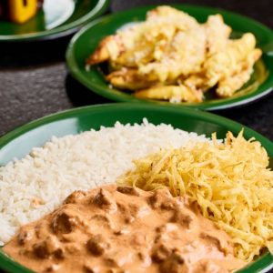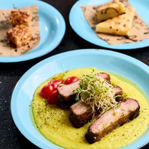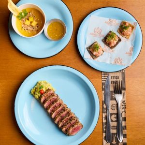 Refrescante e saudável mousse de manga com banana, finalizado com cubinhos de manga, farofa Mahalo e chip de banana da terra. Acompanha molho mango chutney.
