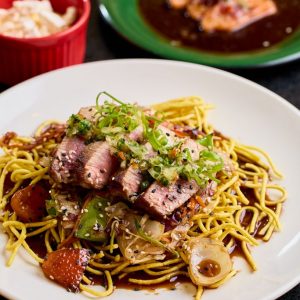 Atum selado na crosta de gergelim com acompanhamento de sunomono e finalizado com um fio de tarê (aprox. 280g).