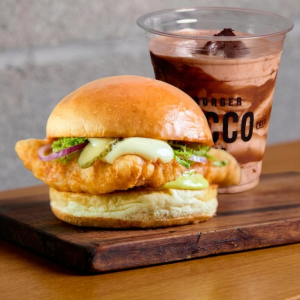 Peixe Empanado, alface picadinho, molho tártaro e pão brioche + Shake fior de latte batido com pedaços de bolo da ivone, calda de chocolate e traços de coco ralado.