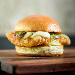 Peixe Empanado, alface picadinho, molho tártaro e pão brioche.